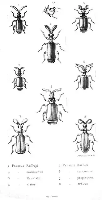 - 1 2 James A. Robertson & Wendy Moore. "Phylogeny of Paussus L. (Carabidae: Paussinae): unravelling morphological convergence associated with myrmecophilous life histories." Systematic Entomology (2016). DOI:10.1111/syen.12205