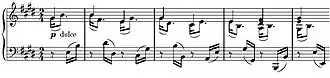 - Het eerste thema is een murmelend 'dolce'-thema, lieflijk, in 2/4 maat met een wiegende zestiendeninvulling in de begeleiding. De luisteraar heeft niet direct door welke melodienoten op de 1e tel van de maat vallen, de maat is dan ook een duidelijk ondergeschikt element;