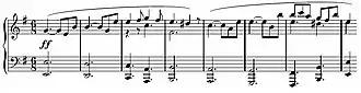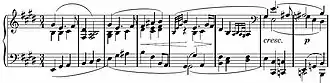 - Het andere thema is een 'adagio espressivo' thema, dat gepassioneerd werkt, beginnend met een verminderd septimeakkoord dat als arpeggio naar forte opstijgt, daarna gevolgd wordt door voorzichtige zestienden, in 3/4 maat. Dit tweede thema herbergt in zijn ontwikkeling enige krachtige pianistische effecten en contrasten.