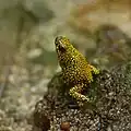 Nicaragua tot in Colombia.Veel variatie, zowel geheel geel gekleurde als meer donkere kleuren komen voor.Gestreepte pijlgifkikker