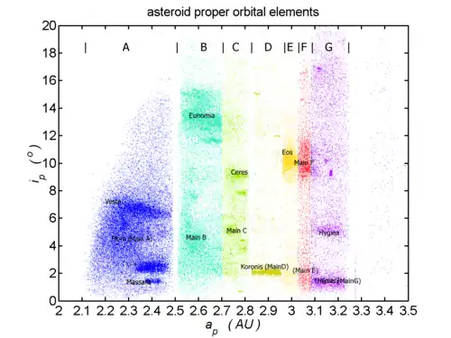 - Themisfamilie, genoemd naar (24) Themis, gemiddelde afstand tot de zon 3,14 AE, de leden hebben spectraalklasse "C";