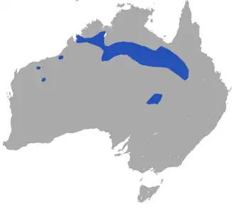 De soort komt voor in gras- en struiklandschappen in Noord-Australië van de Kimberley (West-Australië) tot Townsville (Queensland).