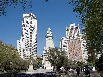 Aan het plein staan twee van de hoogste gebouwen van Madrid, de Torre de Madrid (142 m) en de Edificio España (117 m, "Spanjegebouw"), beide van de hand van de broers Julián en Joaquín Otamendi.