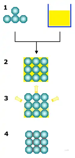 Poederdeeltjes worden voldoende fijn ( ± 20 μmm) gemalen en gemengd (± 50%) met een bindmiddel (1). Vervolgens wordt het mengsel in een spuitgietmachine in een vorm gedrukt (2). Na het spuitgieten wordt het bindmiddel verwijderd door het op te lossen of te verbranden (3). Nadat het bindmiddel is verwijderd wordt het poeder gesinterd (4).