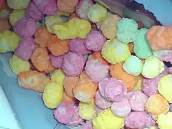 - Rijst. Gepofte rijst wordt bijvoorbeeld toegepast in rijstwafels, en wordt ook in felle kleuren en gezoet met suiker verkocht als snoepgoed.
