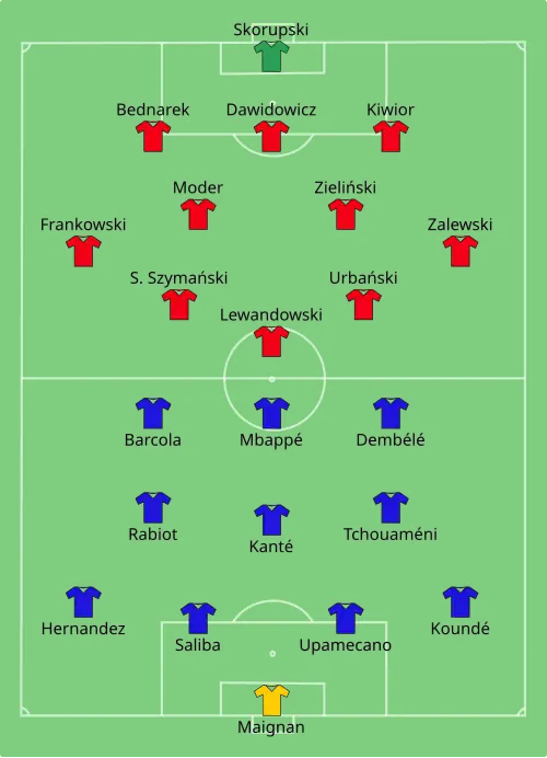 Polen speelde zijn laatste groepswedstrijd, op 25 juni 2024 tegen het al gekwalificeerde Frankrijk in Dortmund, om de eer. Doelman Łukasz Skorupski redde in de eerste helft schoten van Theo Hernández, Ousmane Dembélé en de Franse aanvoerder Kylian Mbappé, terwijl de Franse doelman Mike Maignan een kopbal van Lewandowski stopte. Nadat Skorupski in de tweede helft wederom een schot van Mbappé stopte, werd hij wel door Mbappé geklopt vanaf de penaltystip, nadat Jakub Kiwior een overtreding had gemaakt op Dembélé. In de 77ste minuut mocht ook Lewandowski aanleggen voor een strafschop, nadat Dayot Upamecano een overtreding had gemaakt op Karol Świderski. Zijn poging werd in eerste instantie gekeerd door Maignan, maar die was te vroeg van de doellijn gestapt, waarna Lewandowski bij de tweede poging raak schoot. Zo werd er met 1–1 gelijkgespeeld en eindigde Polen met één punt als laatste in de groep.[10]