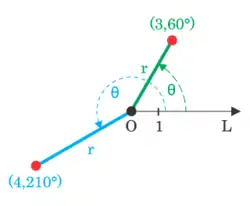 Het coördinatenstelsel bestaat dan uit een vast punt , de pool en een as door dit punt, de poolas. Om de poolcoördinaten van een punt vast te leggen kiest men een as door . De abscis van het punt op die as, met oorsprong , is de eerste coördinaat van . Deze waarde kan negatief zijn. Als tweede coördinaat kiest men een van de mogelijke waarden van de georiënteerde hoek tussen de as en de poolas. Ook hier kan het punt meer paren poolcoördinaten hebben.