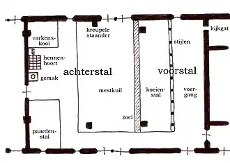 In de achterstal bevond zich een geul met een diepte van ruim een meter, de zoei. Voorbij de zoei was de bodem van de achterstal ongeveer een meter diep uitgegraven, dat was de mestkuil. Over de gebinten van de stal was met balken een schelft gemaakt waarop het hooi lag opgeslagen. In het achterste deel van de achterstal bevonden zich de paardenstal en de varkenskooi. Daartussenin hing een stevig hekwerk van stokken aan de zoldering, met een primitief laddertje daarnaartoe. Op die zogenaamde hennenhoort gingen de kippen 's nachts op stok. Naast de deur naar de schuur stond het gemak, een beerton met daarop een houten deksel met een rond gat waarop ieder die in de boerderij woonde of werkte zijn behoefte deed.