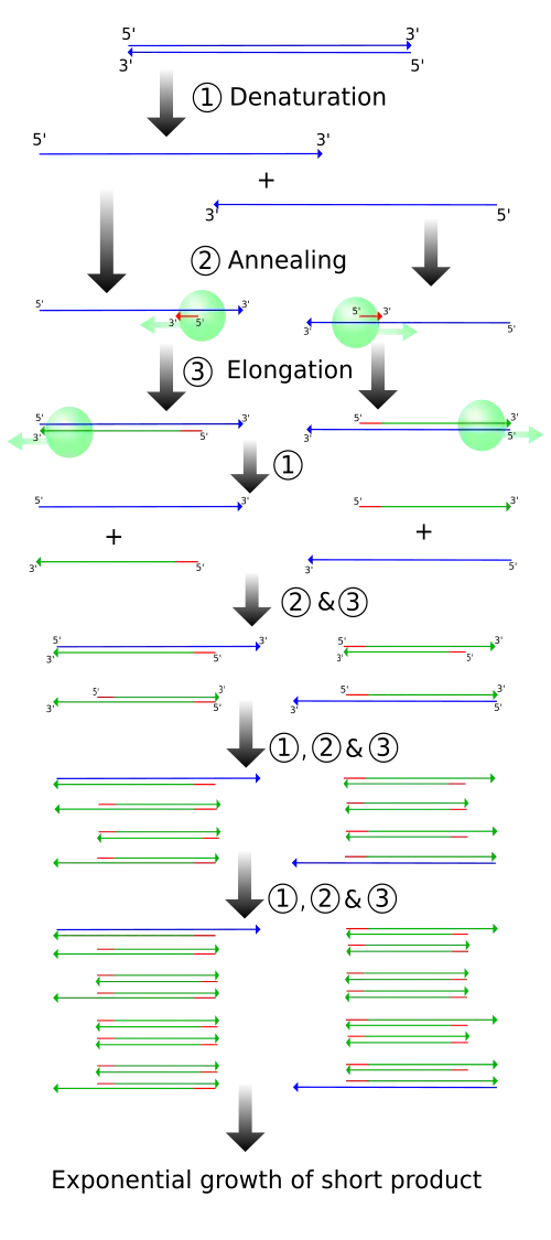 - Nu worden deze stukjes weer door verhitting gesplitst in enkelstrengs-DNA enz. Daar de aanwezige primers voorkeursparing hebben met de twee enkelstrengs-DNA die een verlenging zijn van deze primers worden alleen deze DNA-stukken gerepliceerd. Na enkele cycli is er zoveel DNA aangemaakt dat deze aangetoond kan worden met gelelektroforese.