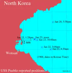 - 1 2 3 (en) NPR Remembering North Korea's Audacious Capture Of The USS Pueblo, 23 jnaurai 2018, geraadpleegd op 16 januari 2023