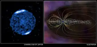 Chandra X-Ray Observatory nam de aurora waar in februari 2003 - zie bijgaande figuur. Het poollicht van Jupiter is rond de duizend keer sterker dan dat op aarde. Het kan verklaard worden met elektrische spanningen van ongeveer 10 miljoen volt en stromen van 10 miljoen ampère - honderd keer meer dan bij de sterkste bliksems op aarde.