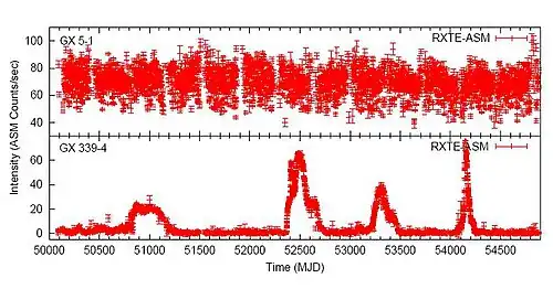 - ↑ Deze grafieken zijn gemaakt met data van de RXTE-ASM, een satelliet die röntgenstraling detecteert.