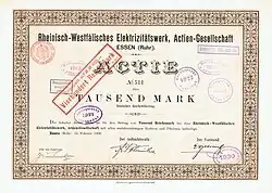 In 1898 werd de Rheinisch-Westfälisches Elektrizitätswerk AG (RWE) opgericht als gemeentelijk nutsbedrijf in Essen. Onder leiding van Hugo Stinnes breidde het bedrijf zich snel uit, vooral door zijn beleid om elektriciteit op te wekken uit de alom aanwezige steenkool ter plaatse. Door de betrokkenheid van lokale overheden als financiers en afzetmarkten groeide RWE in 1914 uit tot een van de grootste stroomleveranciers in het land.