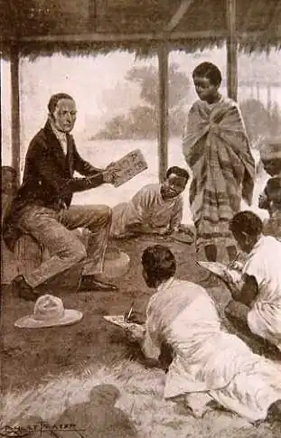 Malagassiërs krijgen taalles van missionaris David Jones.