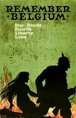 De vierde 'Liberty-Bond-Campaign' van 1918 gebruikte een poster van de illustrator Ellsworth Young met de tekst 'Remember Belgium' die het silhouet van een jong Belgisch meisje toonde dat door een Duitse soldaat wordt meegesleurd met op de achtergrond een brandende gemeenschap. Historica Kimberly Jensen interpreteert de afbeelding op de poster als "Zij (Belgische vrouwen) zijn 's nachts alleen en verkrachting dreigt". Men ging ervan uit dat het Amerikaanse volk wel op de hoogte moest zijn van de gruwelijkheden in het begin van de oorlog, gezien de tekst op de poster. Robert E. Herzstein beweert in zijn boek Roosevelt and Hitler dat de Duitsers geen effectieve manier konden vinden om de krachtige Britse propaganda over de ‘Rape of Belgium’ en andere zogenaamde wreedheden tegen te gaan.