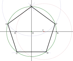 - Teken een cirkel met het middelpunt in , waarop de hoekpunten van de vijfhoek moeten komen te liggen. Deze eerste cirkel is in de figuur groen. Een snijpunt van de verticale as en de groene cirkel is punt .