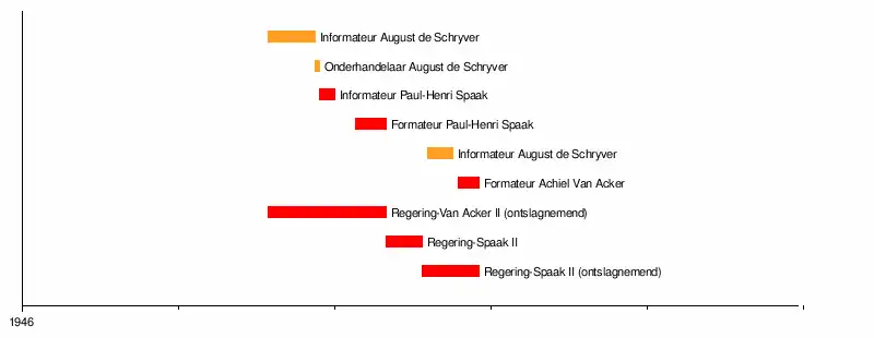 Na de verkiezingen voor het Belgische Parlement op 17 februari 1946 ging de formatie van een nieuwe Belgische regering van start. De formatie duurde in totaal 42 dagen en leidde tot de vorming van de regering-Van Acker III (bestaande uit de socialistische BSP-PSB, de communistische KPB-PCB en de Liberale Partij). Eerst was na 24 dagen formeren de regering-Spaak II gevormd, een socialistische minderheidsregering die bij de vertrouwensstemming in het parlement geen meerderheid achter zich kreeg. Vervolgens duurde het 11 dagen om de regering-Van Acker III op de been te brengen.