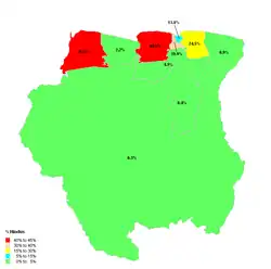 | hindoeïsme | 19,9% | 13,8% | 39,9% | 43,2% | 2,2% | 44,6% | 24,5% | 0,9% | 4,9% | 0,4% | 0,3% |