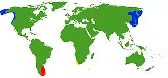 | leefgebied Enteroctopus soorten: E. dofleini in blauw, E. megalocyathus in roodd, E. magnificus in geel, and E. zealandicus in paars. | ||||||||||||||