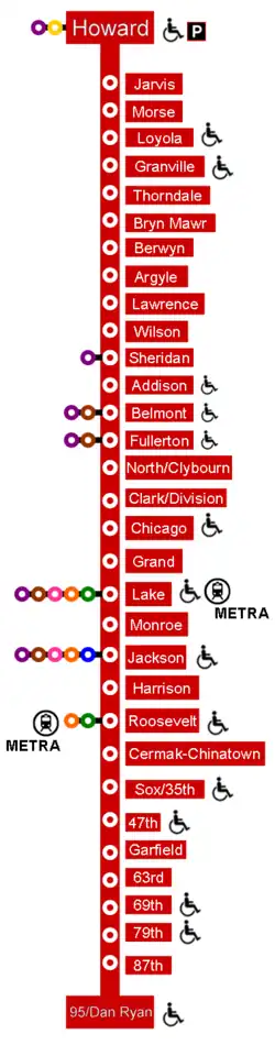 De noord-zuid lijn loopt van de wijk Rogers Park (station Howard) in het uiterste noorden onder State Street door het centrum (de Loop) naar de zuidelijke wijk Roseland (station 95/Dan Ryan). De dienst is 24 uur per dag, 365 dagen per jaar operationeel en doet in totaal 34 stations aan.