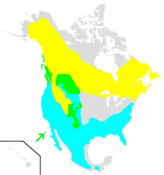| Verspreidingsgebied Geel: broedgebied, alleen in de zomer aanwezig; Groen: Hele jaar aanwezig; Blauw: Overwinteringsgebied. | ||||||||||||