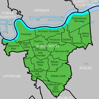 De Royal Borough of Greenwich bestaat uit 17 kiesdistricten (wards), die elk drie raadsleden leveren voor de gemeenteraad, de Greenwich London Borough Council:[5]