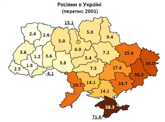Volgens de volkstelling van 2001 vormen de Russen een meerderheid in Sebastopol (71,6%) en de Autonome Republiek de Krim (58,3%), terwijl ze een grote minderheid van 25% of meer in de meeste oblasten in Oost-Oekraïne vormen. In West-Oekraïne vormen de Russen minder dan 5% van de bevolking.