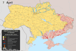 In het noorden belegerde Rusland steden als Tsjernihiv, Soemy en Charkov, maar zonder succes.[68] In het zuiden namen Russische troepen op 2 maart Cherson in en rukten op tot Voznesensk. Op 25 maart verklaarde Rusland de eerste fase van de operatie voor 'voltooid', maar vermeldde niet langer de oorspronkelijke doelen van 'demilitarisatie' en 'denazificatie' van Oekraïne.[69] Tegen april waren Russische troepen teruggetrokken uit het noorden voor bevoorrading en herpositionering richting de Donbas, ter voorbereiding op een hernieuwde aanval in Zuidoost-Oekraïne.[70] Generaal Aleksandr Dvornikov kreeg de leiding over de militaire operaties tijdens deze fase van de invasie.