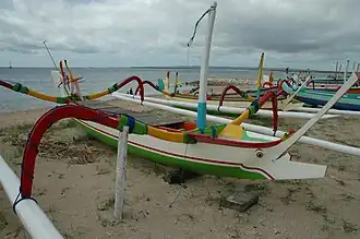 Op het strand liggen veel jukungs, typisch Balinese vissersboten met een driehoekig zeil.