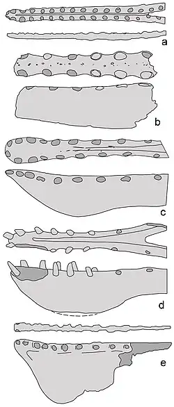 De bewaarde voorkant is 15% smaller dan de achterkant. De bovenkant van de kaak is hol gekromd en de onderkant bol, dit laatste mede door de kam. De kaak is smal, slechts drieënhalf maal breder dan een tandkas overdwars. De randen zijn geschulpt, hol gekromd tussen de tanden. De tanden schuin naar boven en buiten gericht. De ruimte tussen de tanden is groter dan de breedte van de tand in de lengterichting van de kaak gemeten. Het plateau tussen de tandrijen heeft ongeveer de breedte van een tand. De randen van het plateau vormen evenwijdige naar bezijden aflopende richels. De foramina worden achteraan kleiner tussen de vijfde en zesde tand. De foramina zijn via korte kanalen verbonden met twee interne kanalen die evenwijdig lopen aan de kaakranden. De zijden van het plateau worden doorboord door onregelmatig geplaatste kleinere foramina. De botwanden zijn glad, ook op de kam die dus kennelijk geen sterk verankerde hoornschacht droeg.