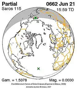 Kleinste gedeeltelijke zonsverduistering 21 juni 662 - 0,00295