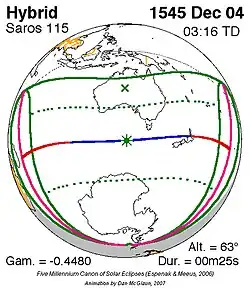 Kortste hybride zonsverduistering 15 dec. 1563 0m 10s -