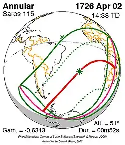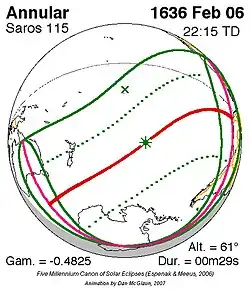 Kortste ringvormige zonsverduistering 25 dec. 1581 0m 4s -