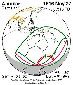 Langste ringvormige zonsverduistering 27 mei 1816 1m 54s -