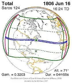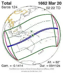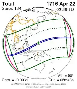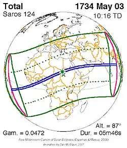 Langste totale zonsverduistering 3 mei 1734 5m 46s -