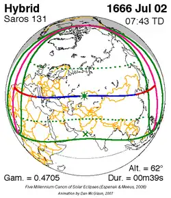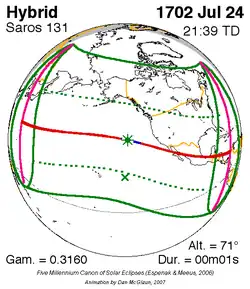 Kortste hybride zonsverduistering 24 juli 1702 0m 1s -