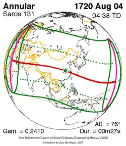 Kortste ringvormige zonsverduistering 4 aug. 1720 0m 27s -