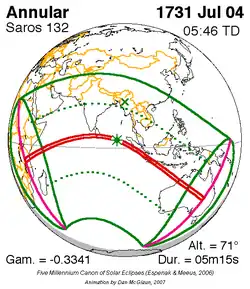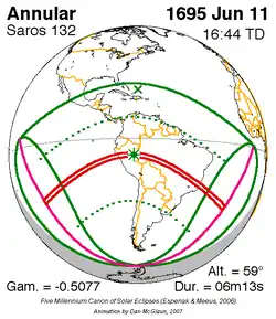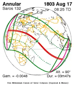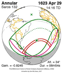 Langste ringvormige zonsverduistering 9 mei 1641 6m 56s -