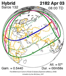 Langste hybride zonsverduistering 3 apr. 2182 0m 58s -