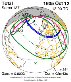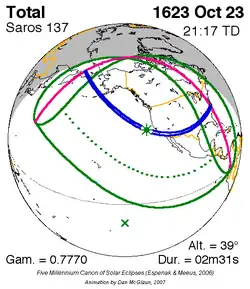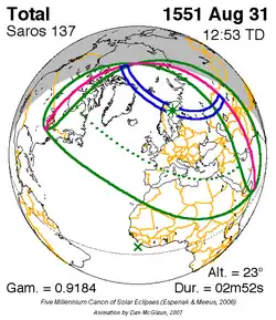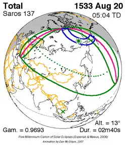 Langste totale zonsverduistering 10 sep. 1569 2m 55s -