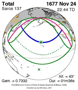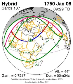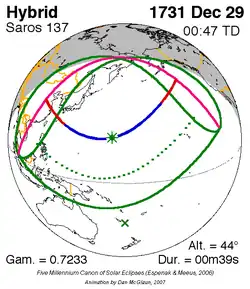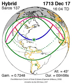 Langste hybride zonsverduistering 17 dec. 1713 0m 56s -