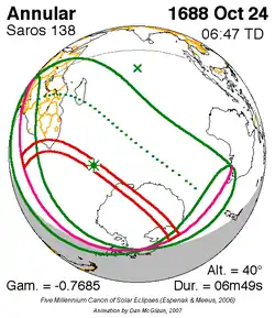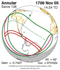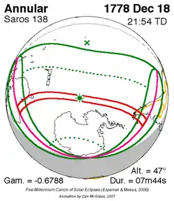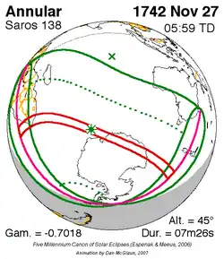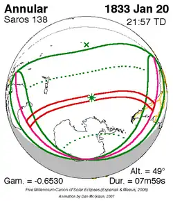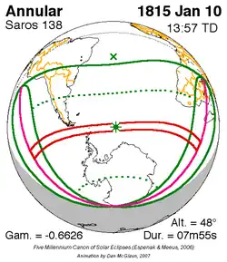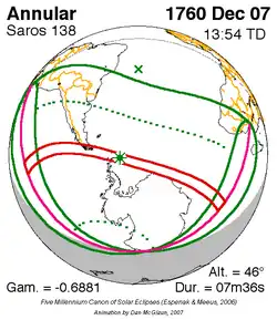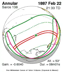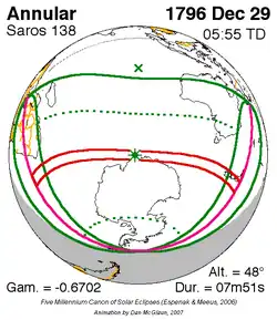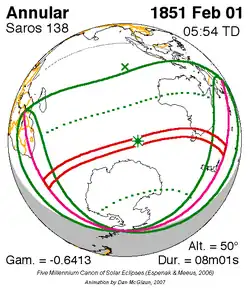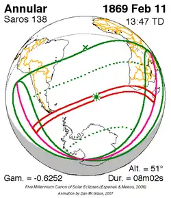 Langste ringvormige zonsverduistering 11 feb. 1869 8m 2s -