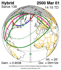 Langste hybride zonsverduistering 1 mrt. 2500 0m 12s -