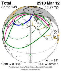 Kortste totale zonsverduistering 12 mrt. 2518 0m 31s -