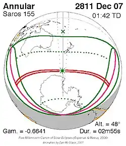 Langste ringvormige zonsverduistering 28 apr. 3046 5m 31s -