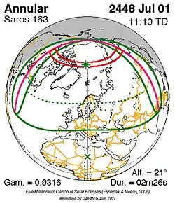 Langste ringvormige zonsverduistering 1 juli 2448 2m 26s -