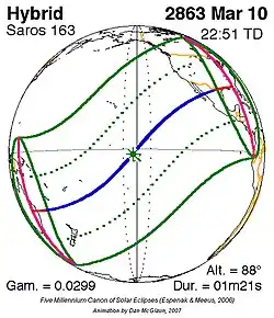 Langste hybride zonsverduistering 10 mrt. 2863 1m 21s -