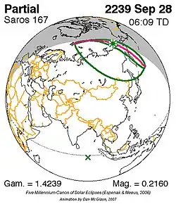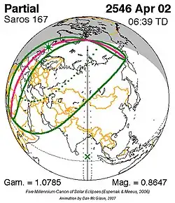 Saros 167 is een reeks zonsverduisteringen in de periode 6 september 2203 t/m 24 oktober 3483 . Deze serie duurt 1280 jaar en 48 dagen, bevat 72 verduisteringen en valt samen met de Inexserienrs 14 t/m 85.