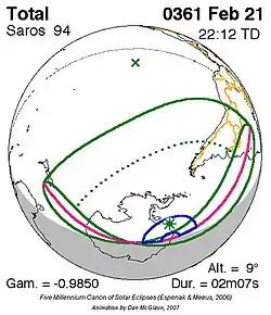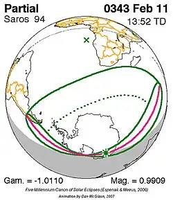 Grootste gedeeltelijke zonsverduistering 11 februari 343 - 0,99063