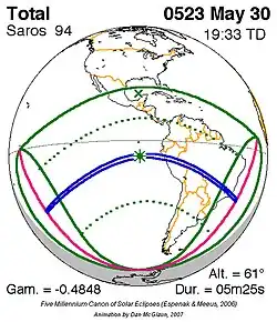 Langste totale zonsverduistering 30 mei 523 5m 25s -
